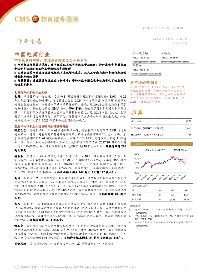 电商行业:招商证券(香港)-中国电商行业:四季度业绩前瞻;首选推荐阿里巴巴和拼多多-260115