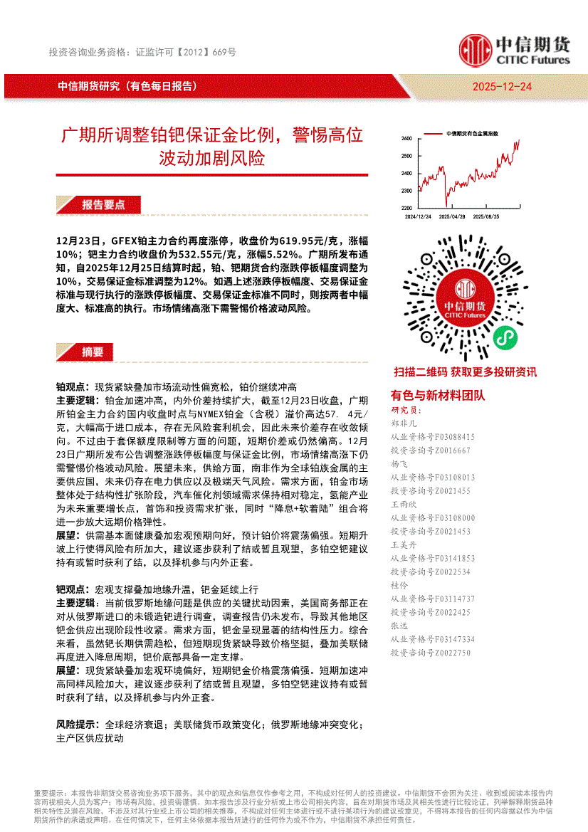中信期货-有色每日报告:广期所调整铂钯保证金比例,警惕高位波动加剧风险-251224