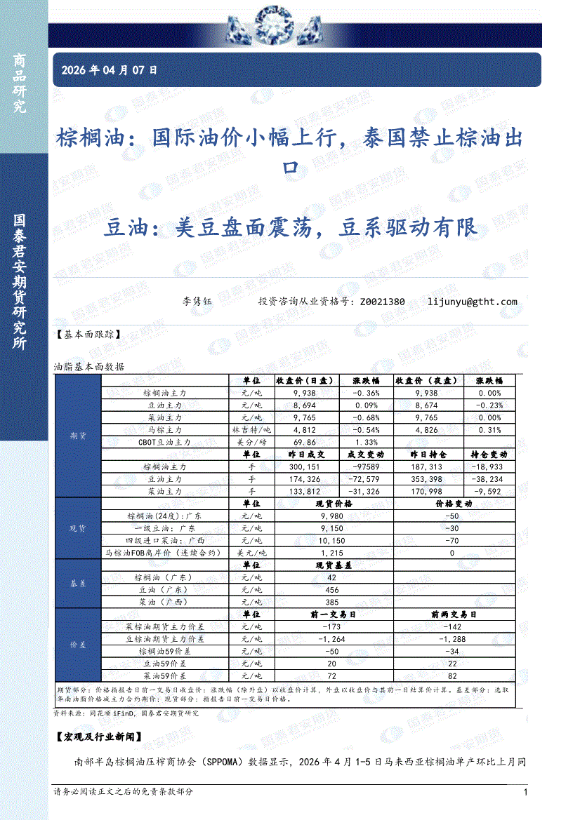 国泰君安期货-棕榈油:国际油价小幅上行,泰国禁止棕油出口;豆油,美豆盘面震荡,豆系驱动有限-260407
