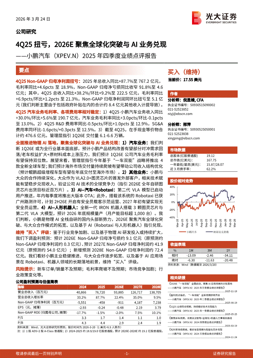 小鹏汽车:光大证券-小鹏汽车-XPEV.US-2025年四季度业绩点评报告:4Q25扭亏,2026E聚焦全球化突破与AI业务兑现-260324