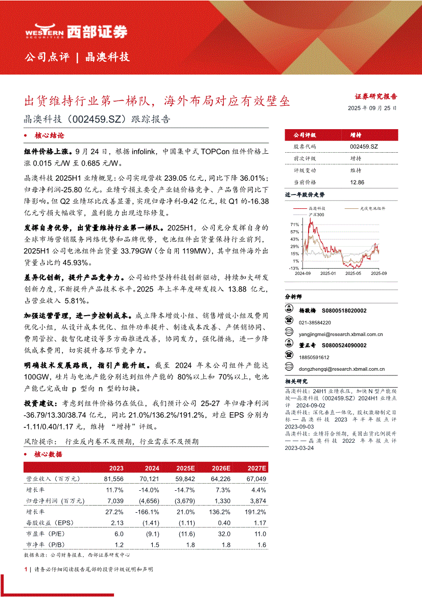 晶澳科技:西部证券-晶澳科技-002459-跟踪报告:出货维持行业第一梯队,海外布局对应有效壁垒-250925