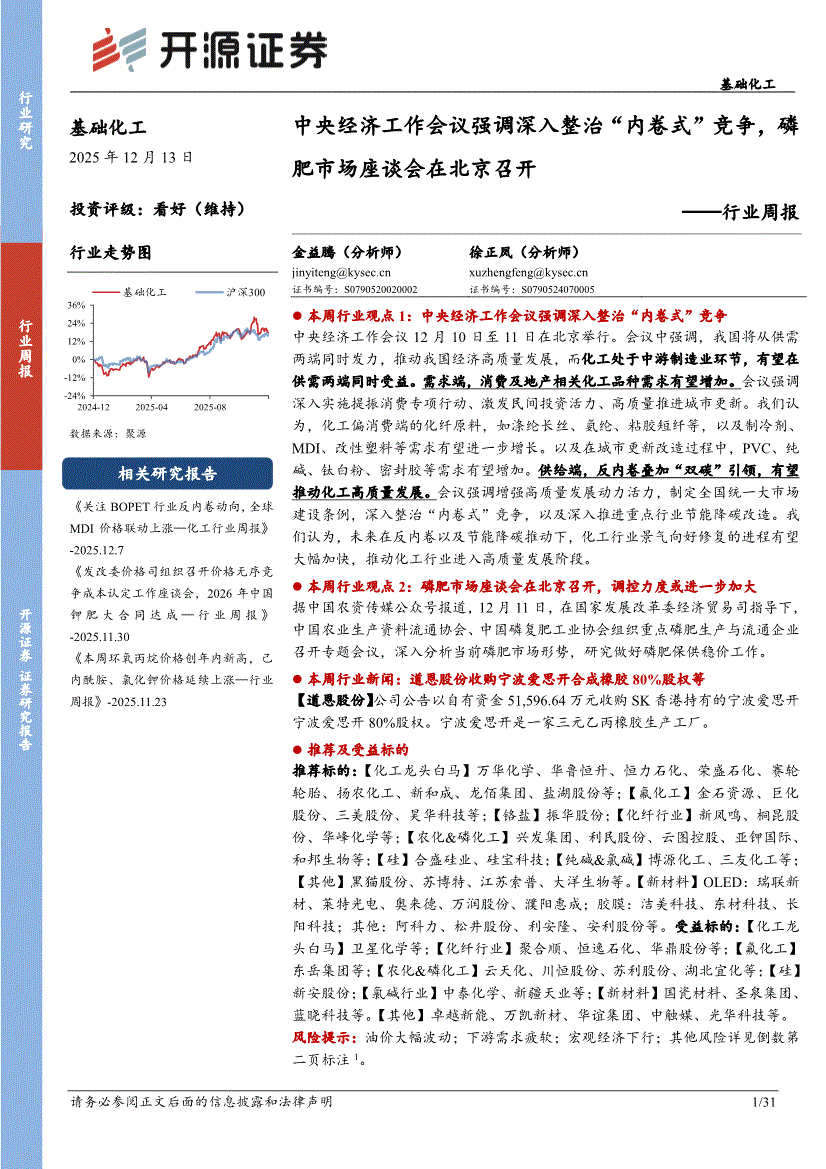 基础化工行业:开源证券-基础化工行业周报:中央经济工作会议强调深入整治“内卷式”竞争,磷肥市场座谈会在北京召开-251213