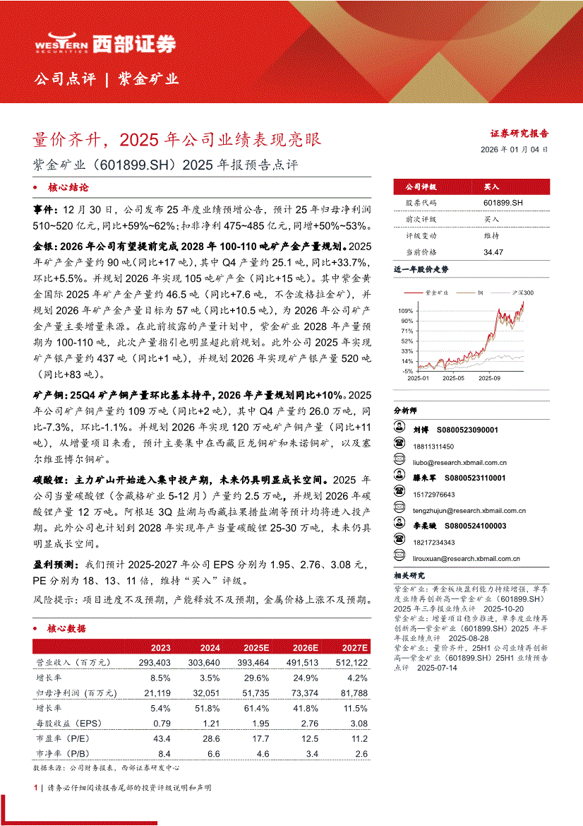 紫金矿业:西部证券-紫金矿业-601899-2025年报预告点评:量价齐升,2025年公司业绩表现亮眼-260104