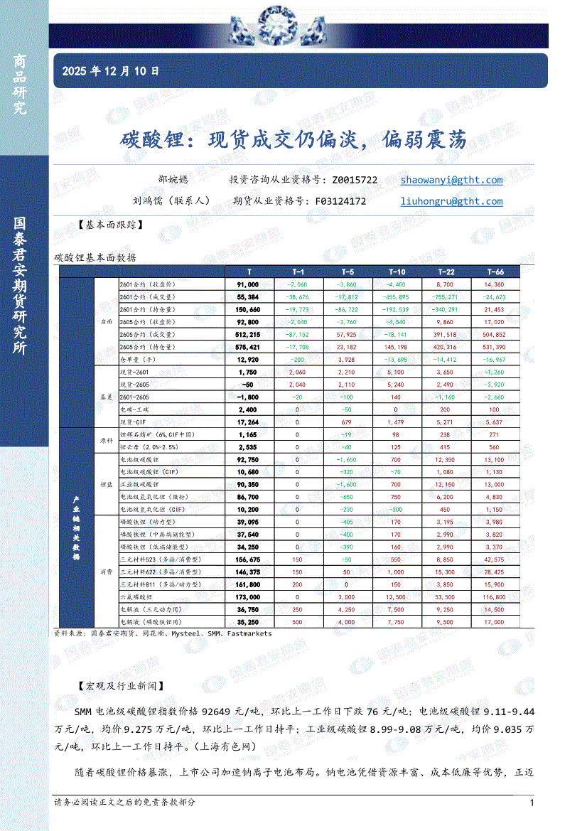国泰君安期货-碳酸锂:现货成交仍偏淡,偏弱震荡-251210
