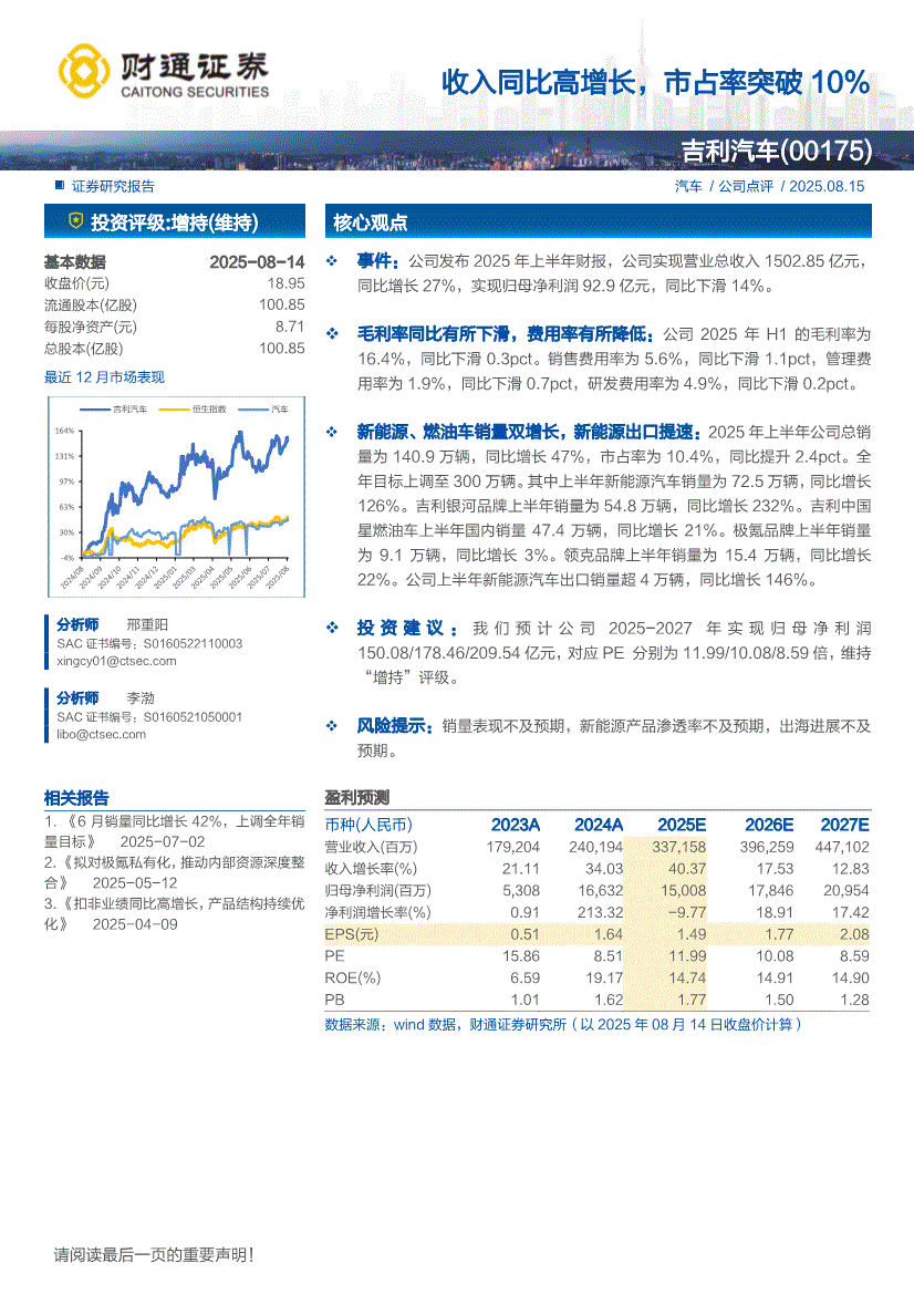 吉利汽车:财通证券-吉利汽车-0175.HK-收入同比高增长,市占率突破10%-250815