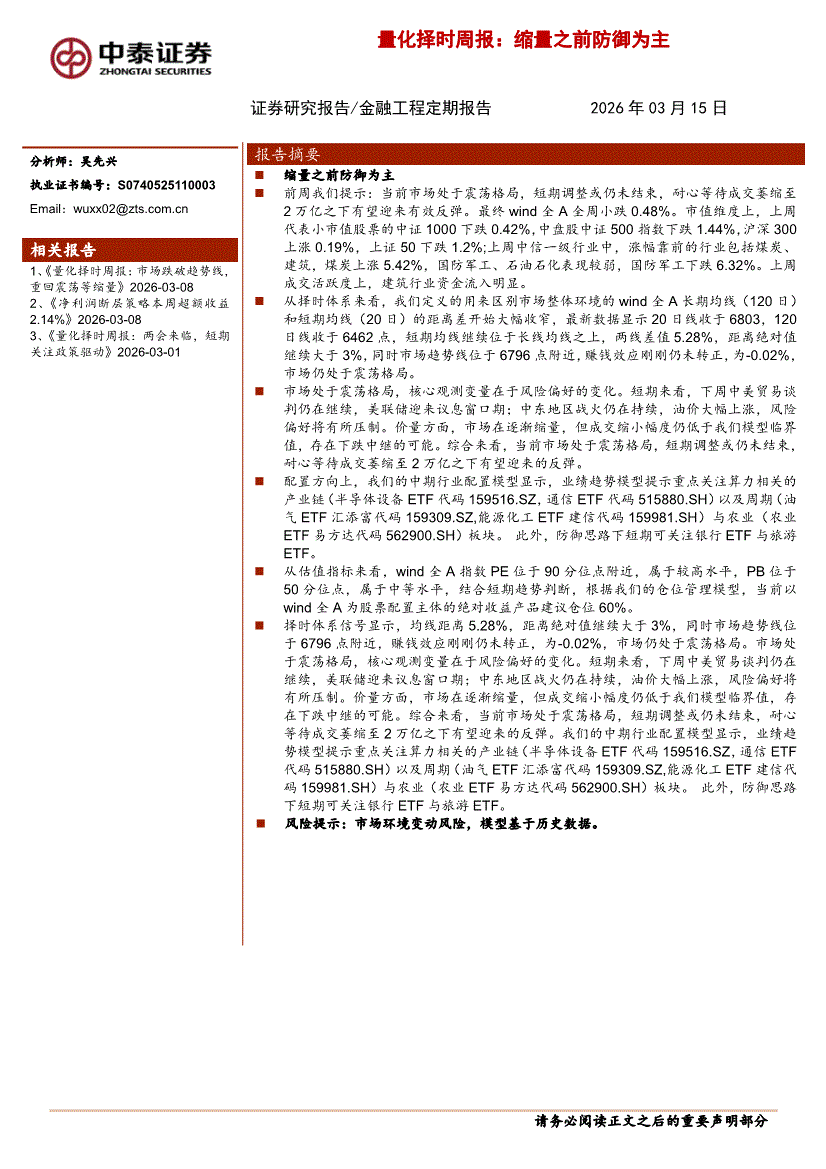 中泰证券-量化择时周报:缩量之前防御为主-260315