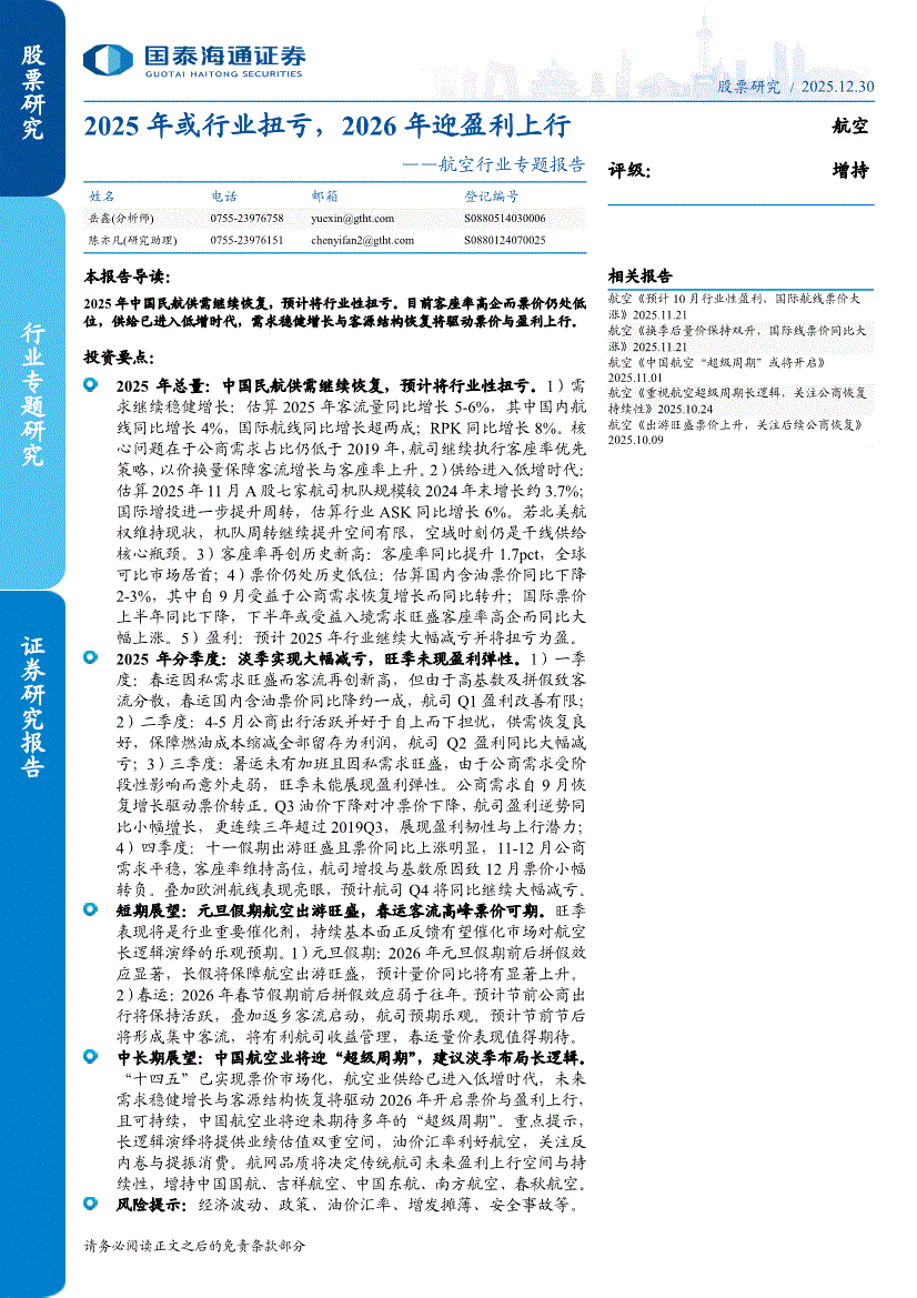 航空行业:国泰海通证券-航空行业专题报告:2025年或行业扭亏,2026年迎盈利上行-251230