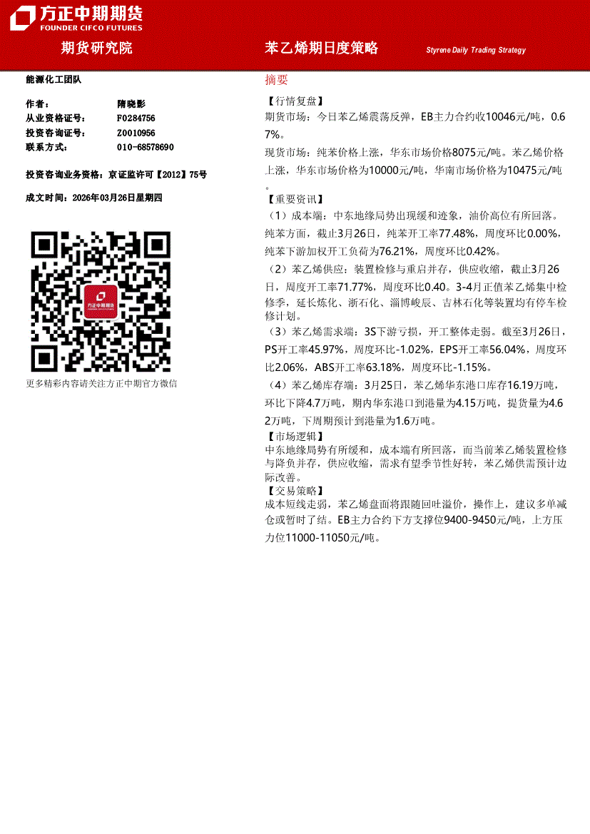 方正中期期货-苯乙烯期日度策略-260326