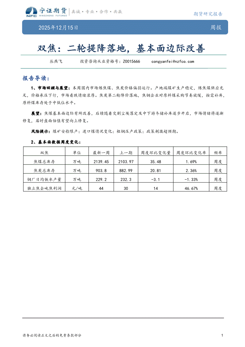 宁证期货-双焦周报:二轮提降落地,基本面边际改善-251215