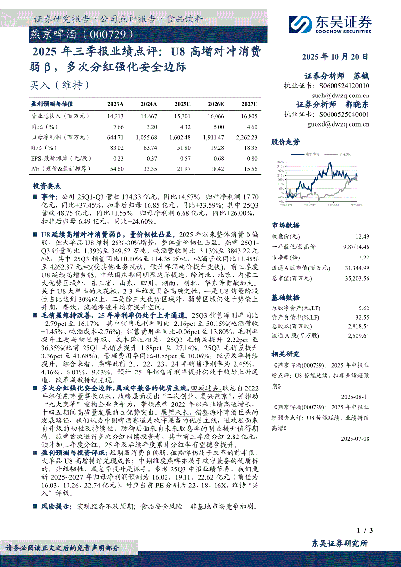 燕京啤酒:东吴证券-燕京啤酒-000729-2025年三季报业绩点评:U8高增对冲消费弱β,多次分红强化安全边际-251020