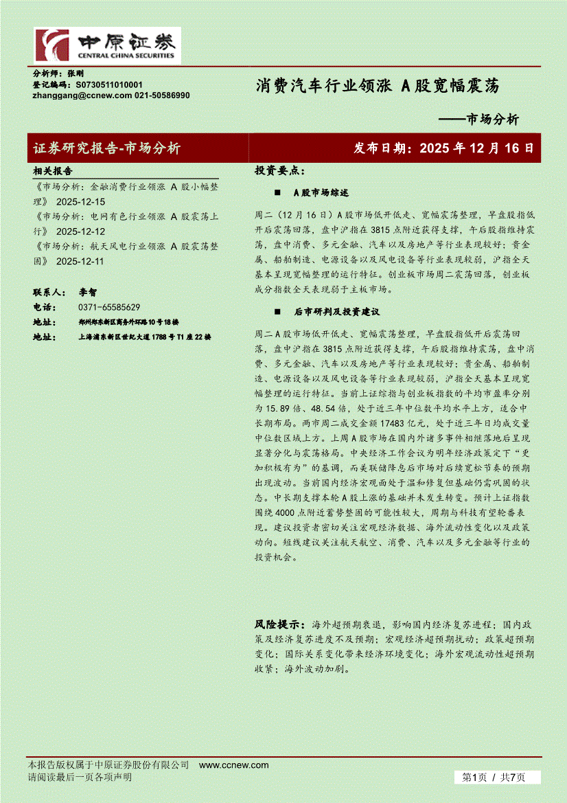 中原证券-市场分析:消费汽车行业领涨,A股宽幅震荡-251216