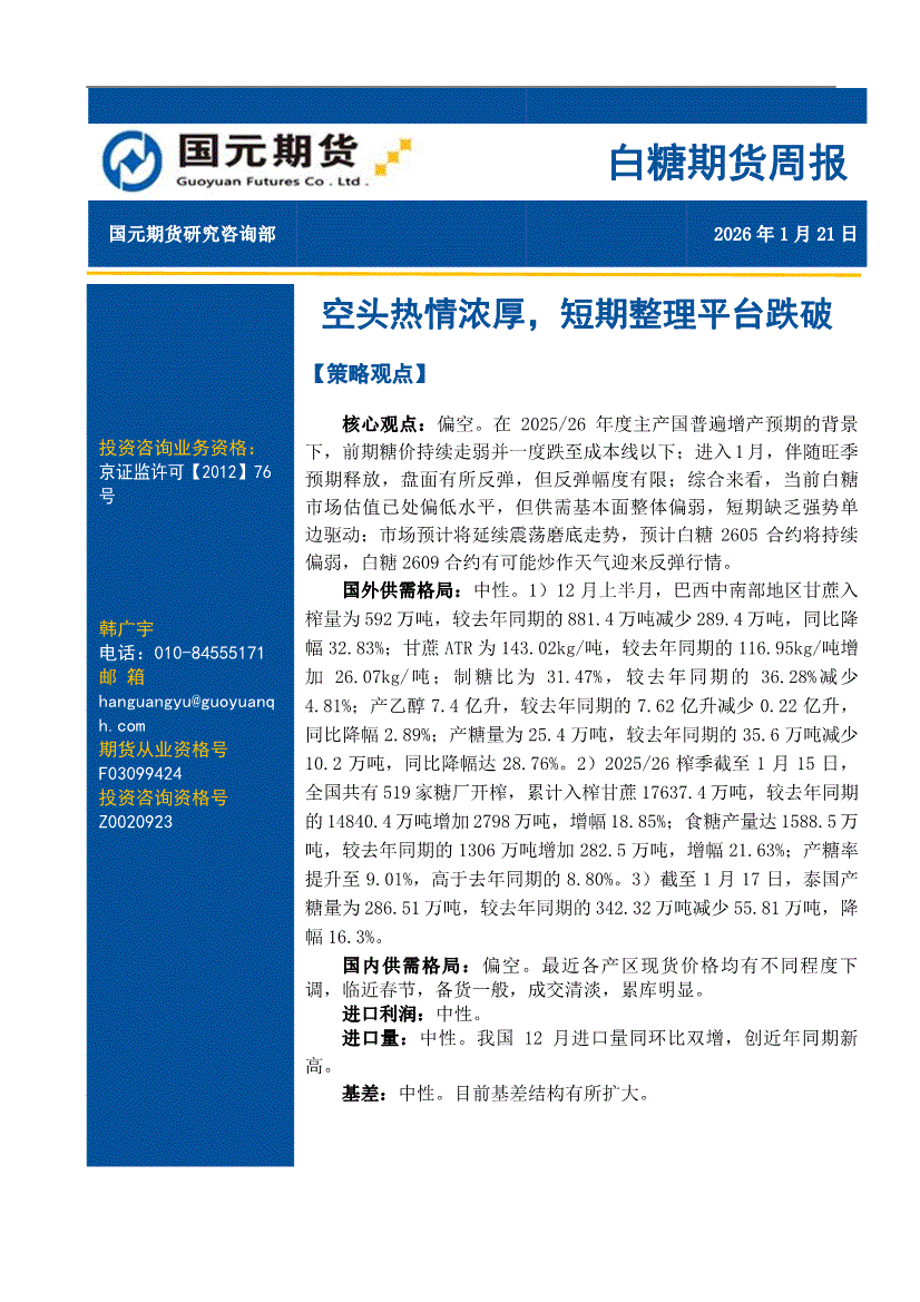国元期货-白糖期货周报:空头热情浓厚,短期整理平台跌破-260121