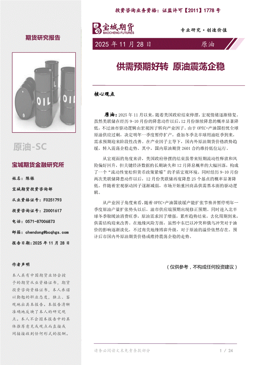 宝城期货-原油月报:供需预期好转,原油震荡企稳-251128
