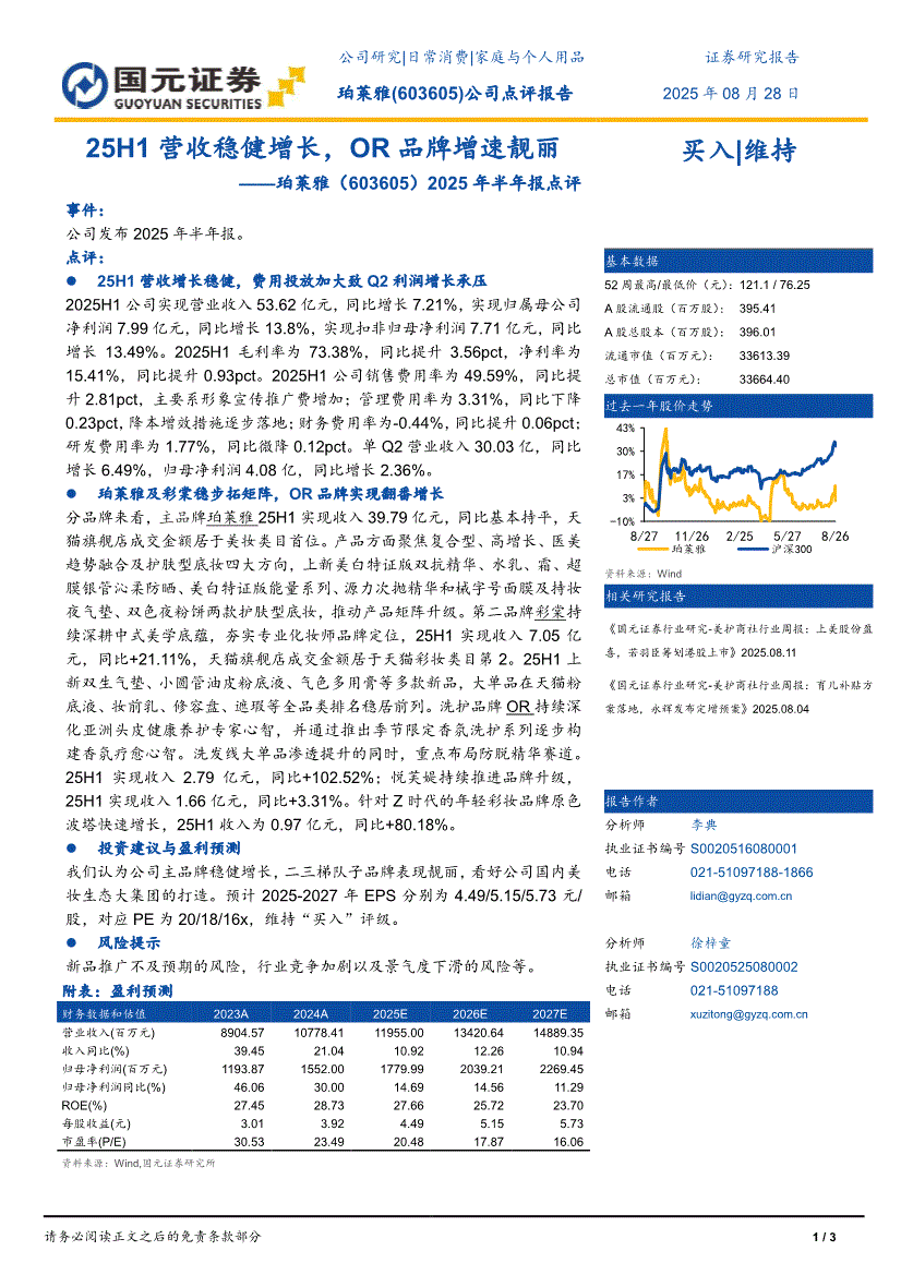 珀莱雅:国元证券-珀莱雅-603605-2025年半年报点评:25H1营收稳健增长,OR品牌增速靓丽-250828