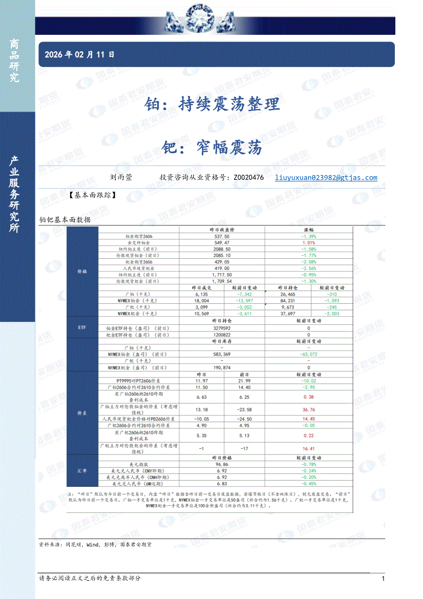 国泰君安期货-铂:持续震荡整理,钯,窄幅震荡-260211