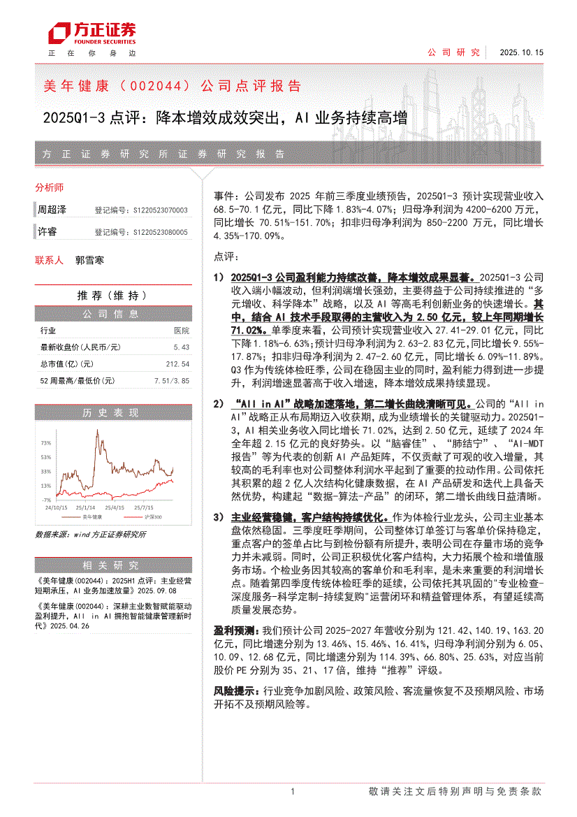 美年健康:方正证券-美年健康-002044-2025Q1~3点评:降本增效成效突出,AI业务持续高增-251015