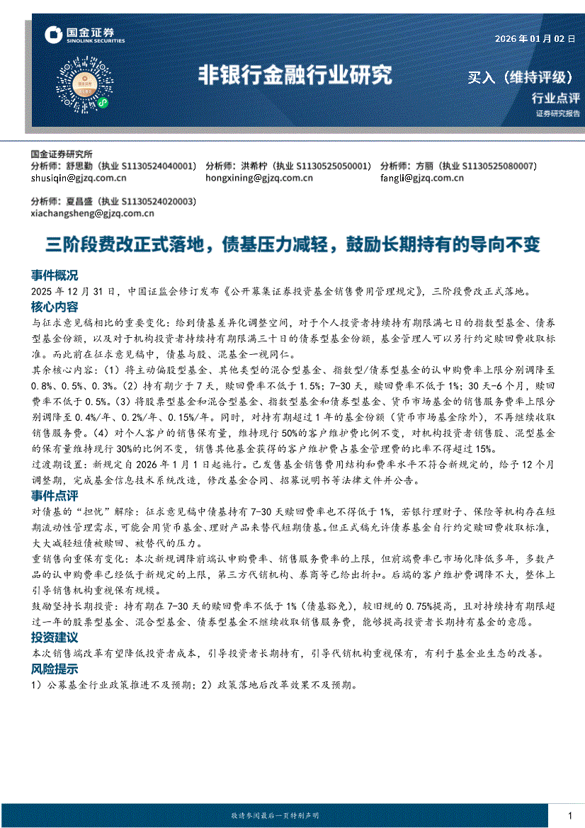 非银行金融行业:国金证券-非银行金融行业:三阶段费改正式落地,债基压力减轻,鼓励长期持有的导向不变-260102
