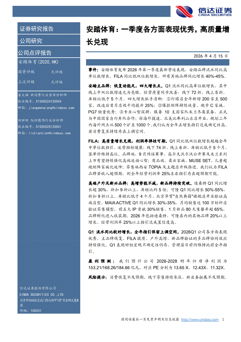 安踏体育:信达证券-安踏体育-2020.HK-一季度各方面表现优秀,高质量增长兑现-260415