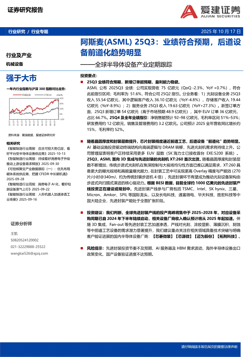 半导体设备行业:爱建证券-全球半导体设备行业产业定期跟踪:阿斯麦(ASML)25Q3,业绩符合预期,后道设备前道化趋势明显-251017