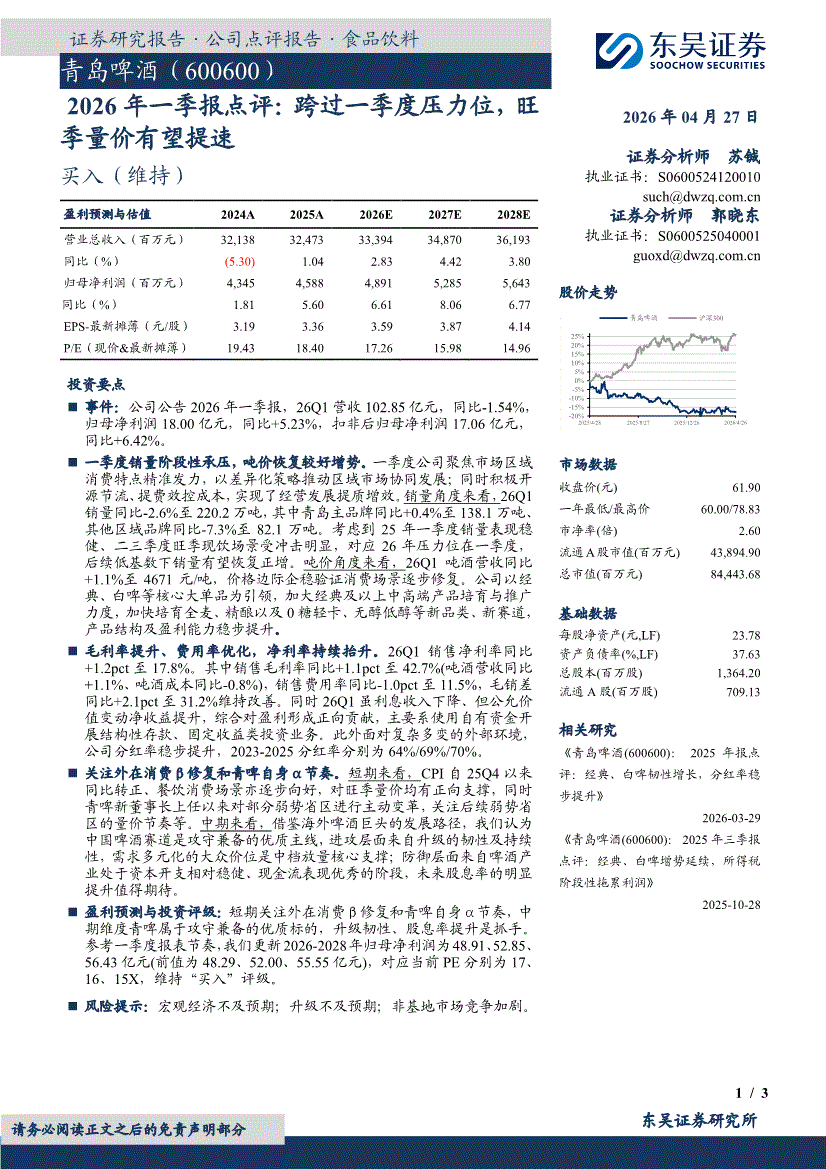 青岛啤酒:东吴证券-青岛啤酒-600600-2026年一季报点评:跨过一季度压力位,旺季量价有望提速-260427