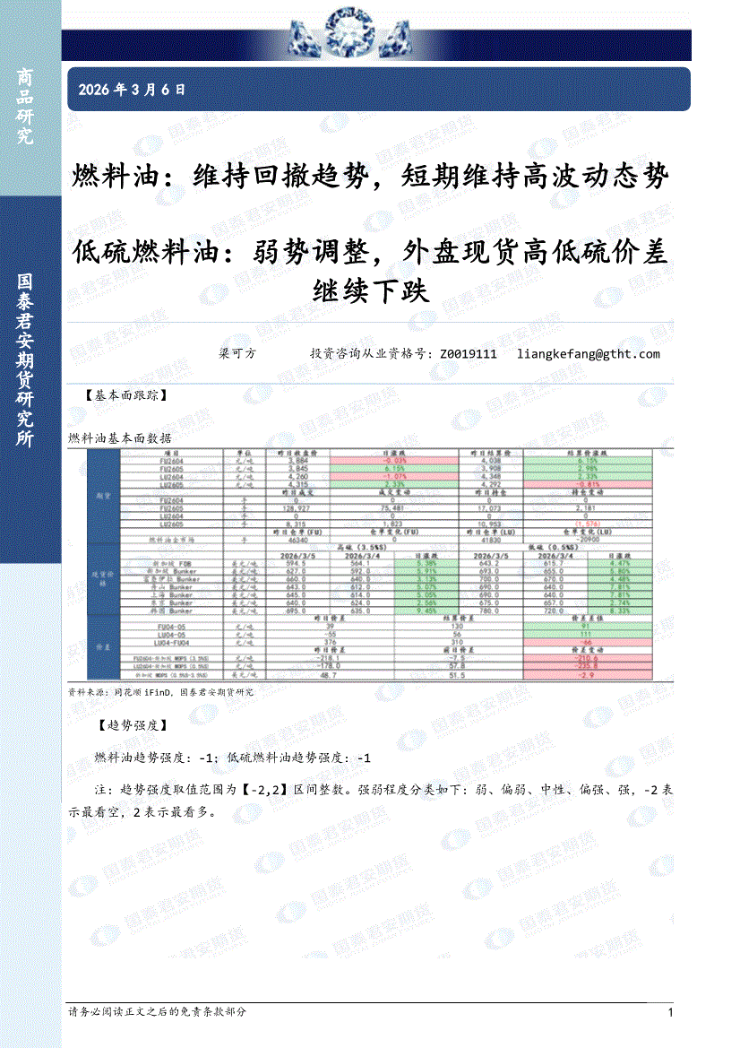 国泰君安期货-燃料油:维持回撤趋势,短期维持高波动态势,低硫燃料油,弱势调整,外盘现货高低硫价差继续下跌-260306