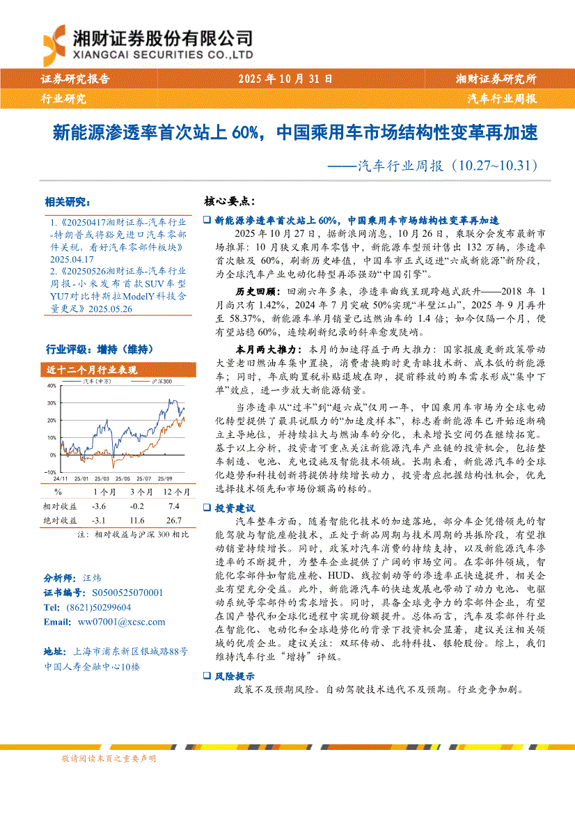 汽车行业:湘财证券-汽车行业周报:新能源渗透率首次站上60%,中国乘用车市场结构性变革再加速-251031