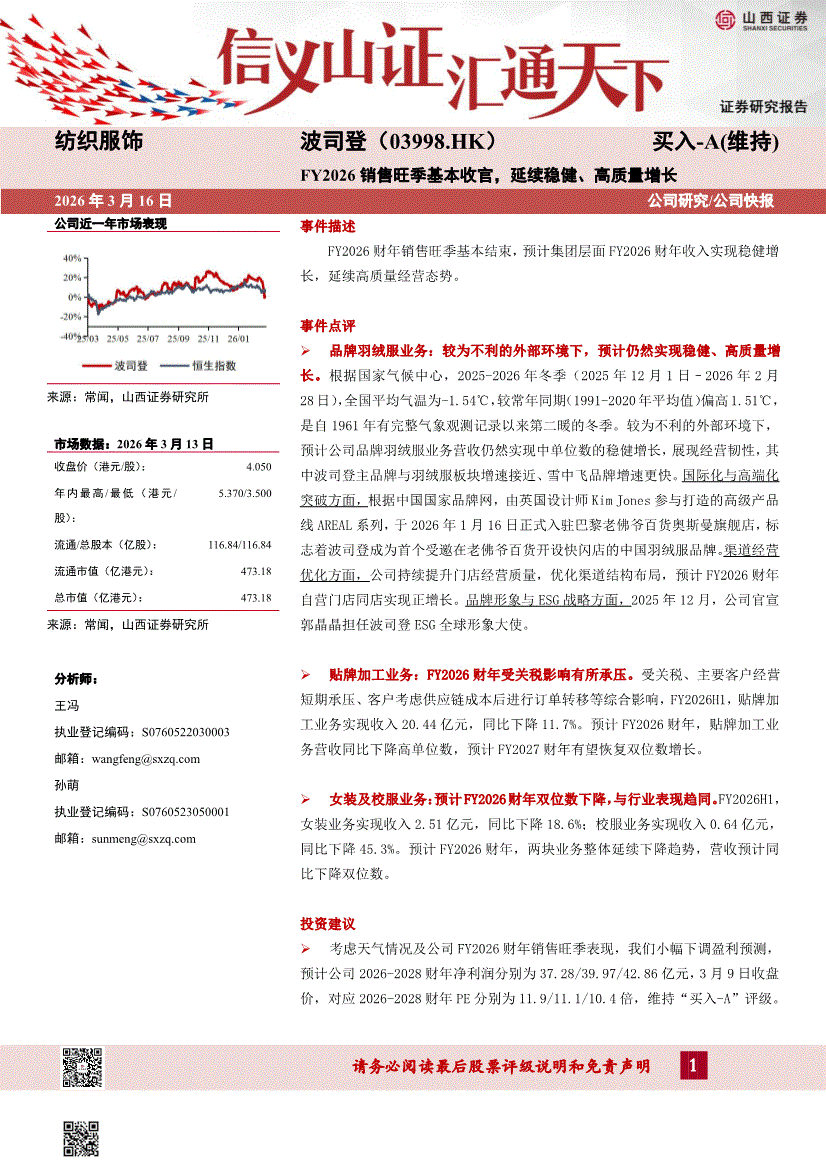 波司登:山西证券-波司登-3998.HK-FY2026销售旺季基本收官,延续稳健、高质量增长-260316