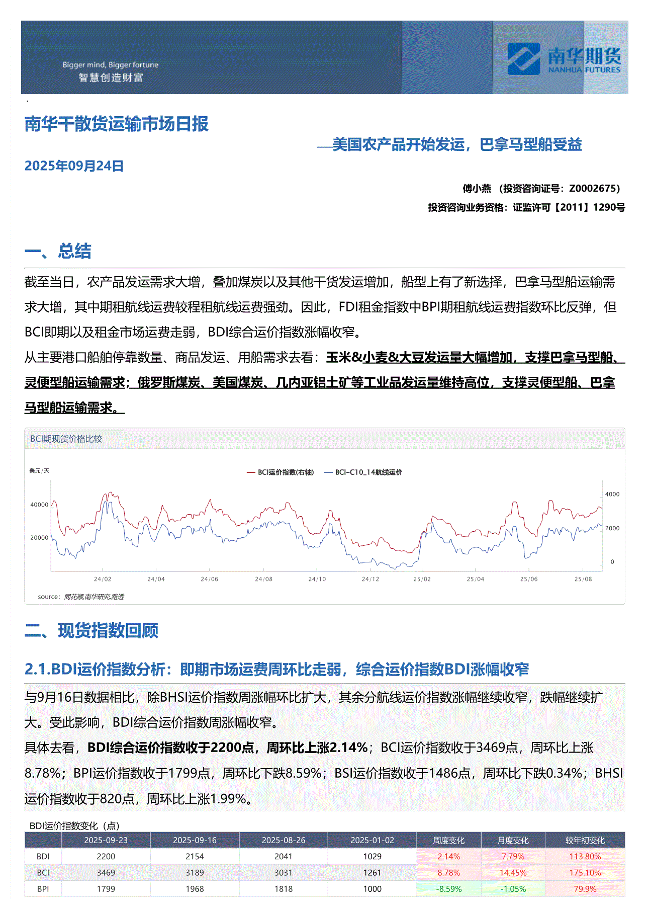 南华期货-干散货运输市场日报:小麦&大豆发运量大幅减少,拖累灵便型船舶运输需求,BSI运价指数由涨转跌-250922