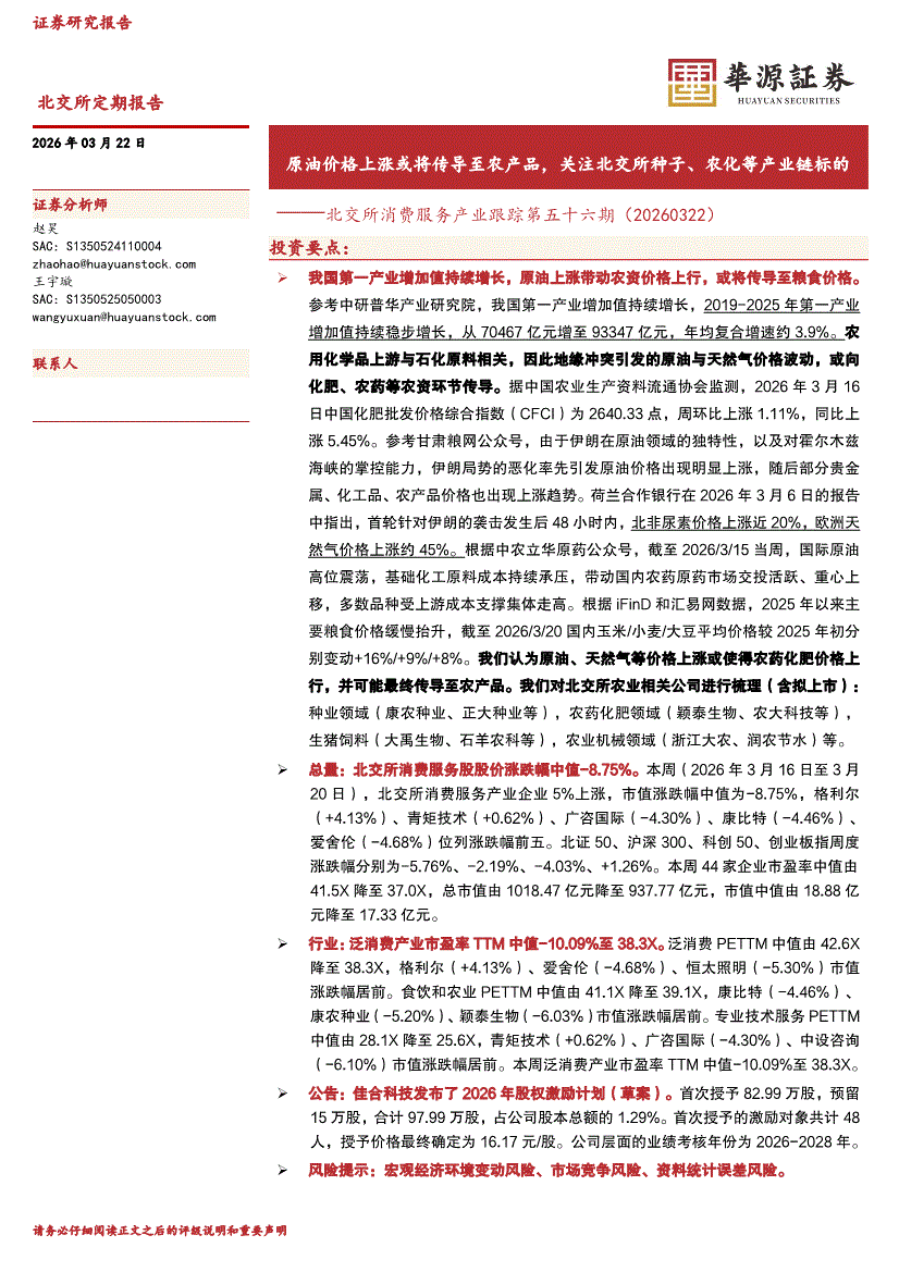 华源证券-北交所消费服务产业跟踪第五十六期:原油价格上涨或将传导至农产品,关注北交所种子、农化等产业链标的-260322