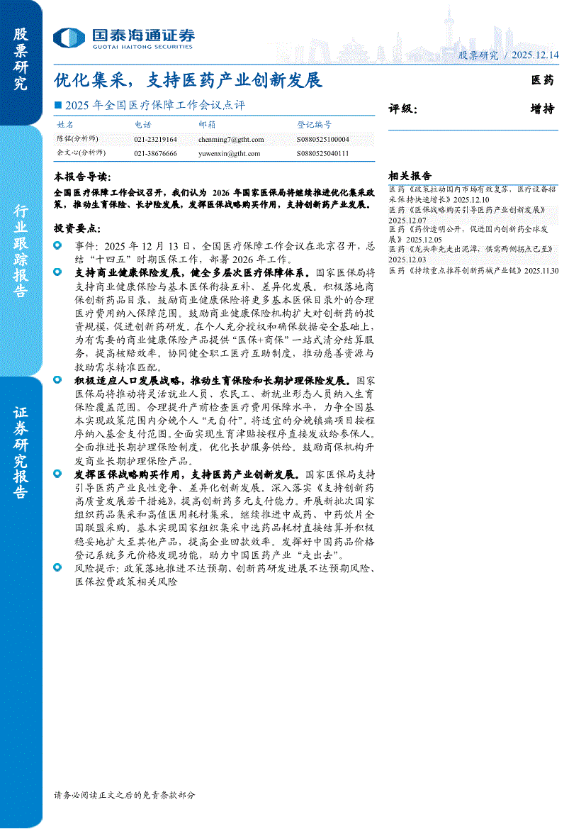 医药行业:国泰君安-医药行业:2025年全国医疗保障工作会议点评,优化集采,支持医药产业创新发展-251214
