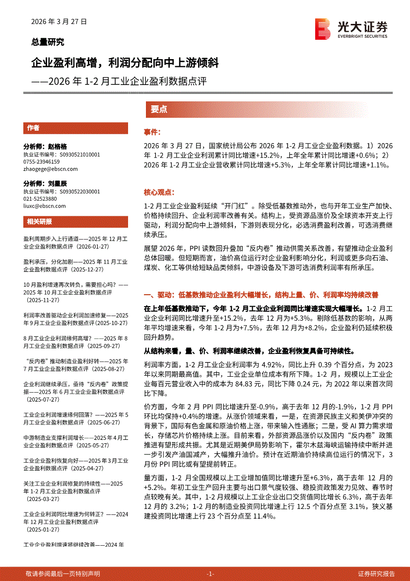 光大证券-2026年1~2月工业企业盈利数据点评:企业盈利高增,利润分配向中上游倾斜-260327