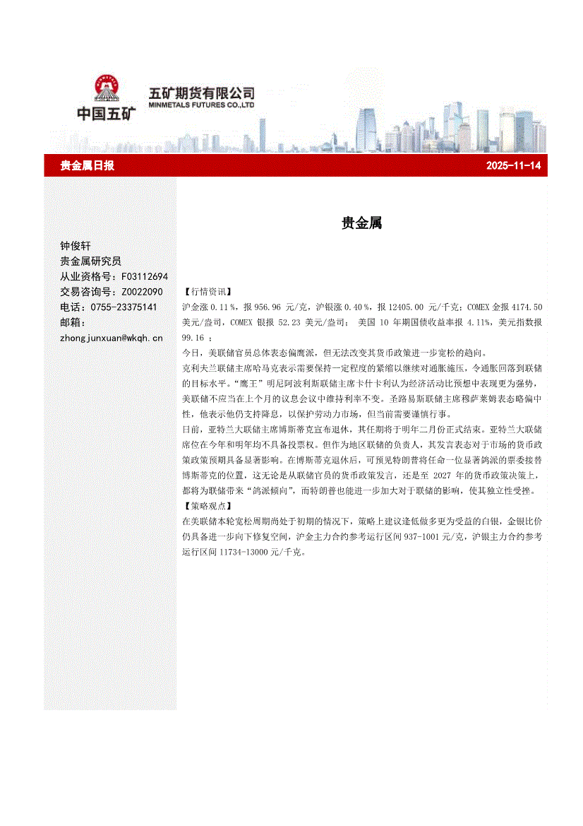 五矿期货-贵金属月报:美联储进一步宽松确定性上升,静待价格盘整-251107