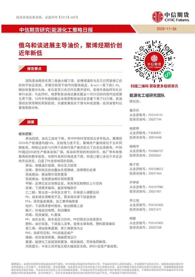 中信期货-能源化工策略日报:俄乌和谈进展主导油价,聚烯烃期价创近年新低-251126
