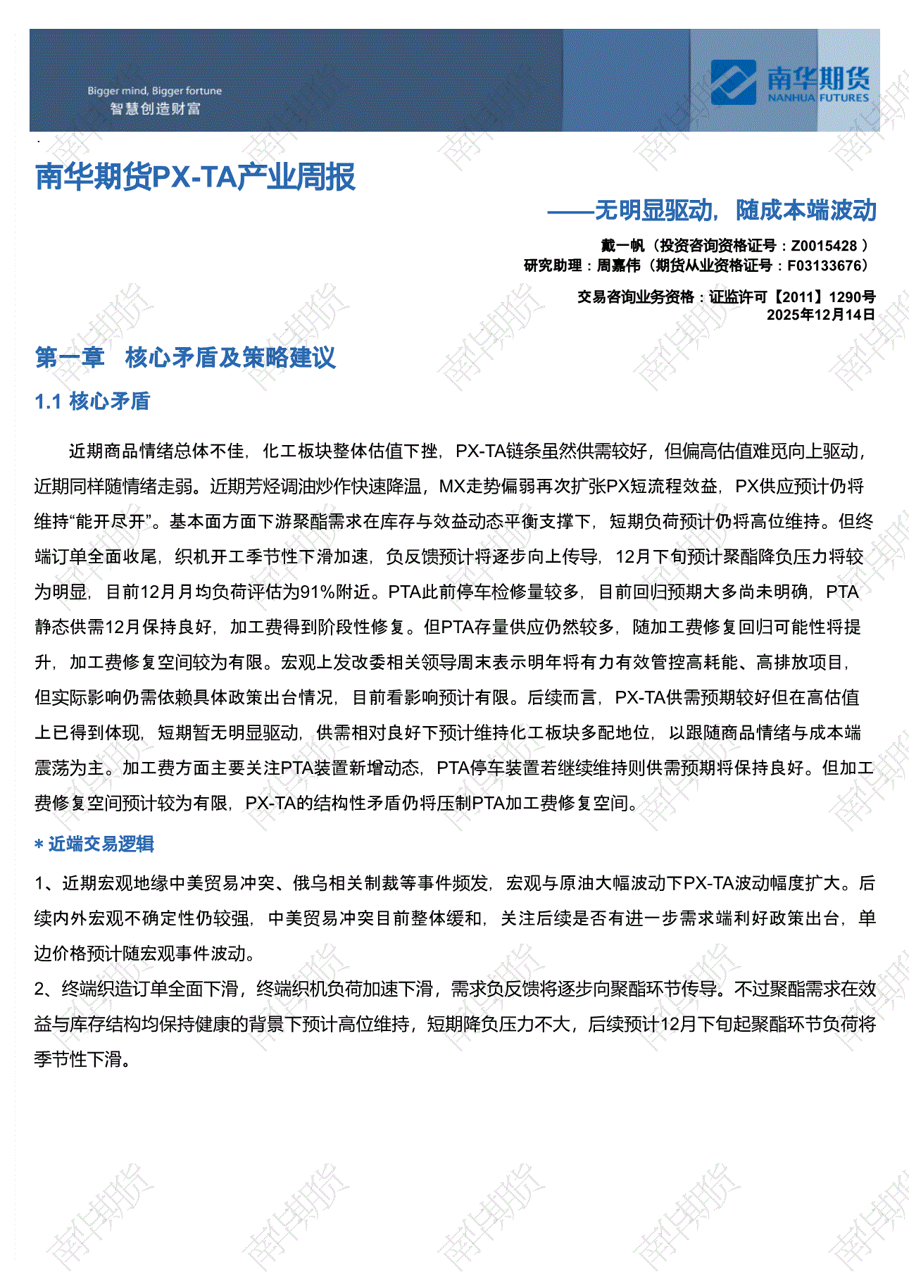 南华期货-PX~TA产业周报:无明显驱动,随成本端波动-251214