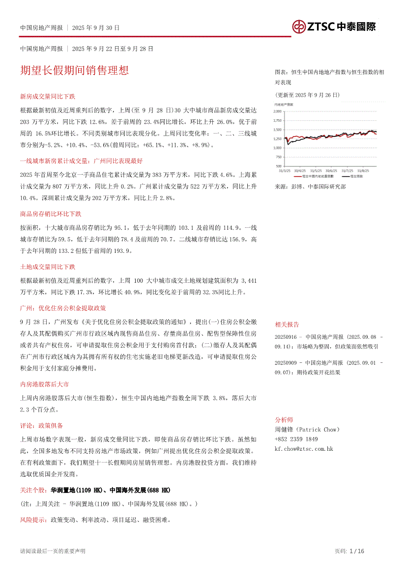 房地产行业:中泰国际-中国房地产行业周报:期望长假期间销售理想-250930
