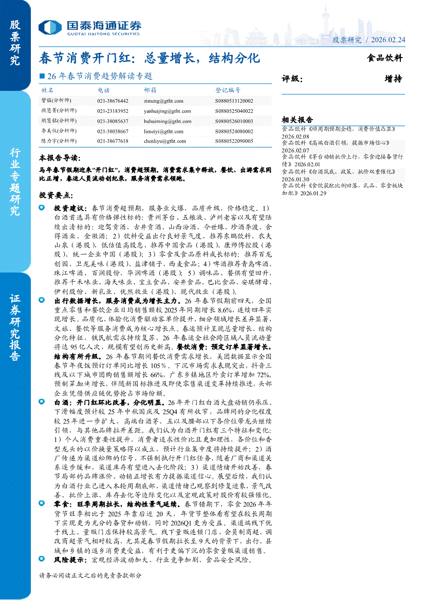 食品饮料行业:国泰海通证券-食品饮料行业26年春节消费趋势解读专题:春节消费开门红,总量增长,结构分化-260224