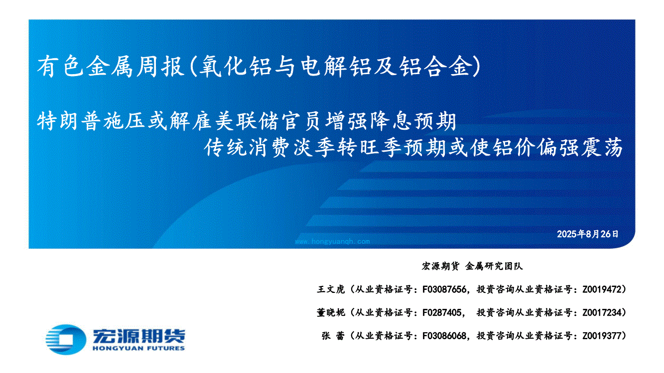 宏源期货-有色金属周报(氧化铝与电解铝及铝合金):特朗普施压或解雇美联储官员增强降息预期,传统消费淡季转旺季预期或使铝价偏强震荡-250826