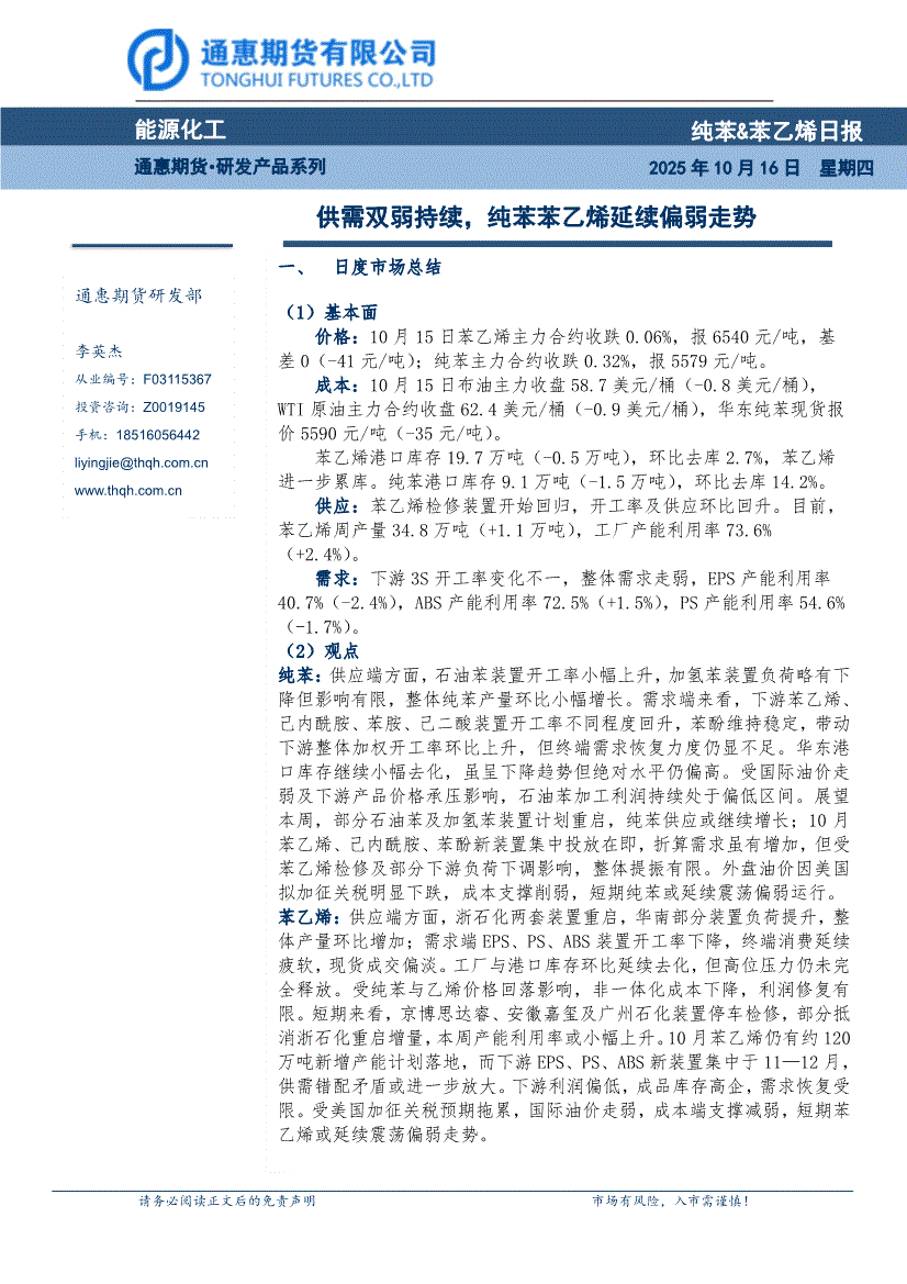 通惠期货-纯苯&苯乙烯日报:供需双弱持续,纯苯苯乙烯延续偏弱走势-251016