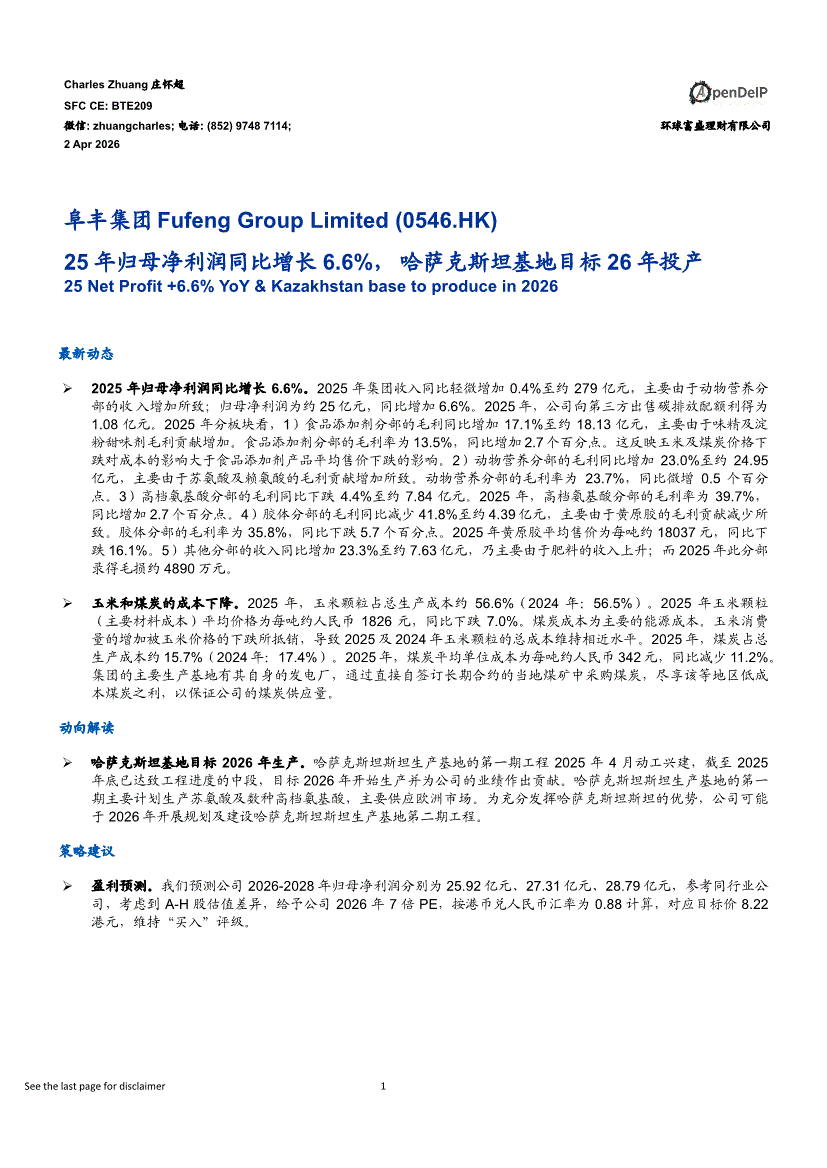 阜丰集团:环球富盛-阜丰集团-0546.HK-25年归母净利润同比增长6.6%,哈萨克斯坦基地目标26年投产-260402