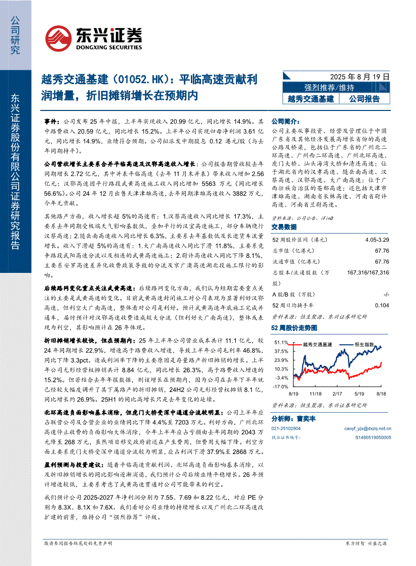 越秀交通基建:东兴证券-越秀交通基建-1052.HK-平临高速贡献利润增量,折旧摊销增长在预期内-250819