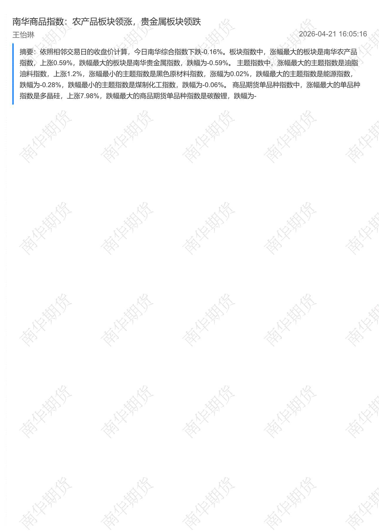 南华期货-南华商品指数:农产品板块领涨,贵金属板块领跌-260421