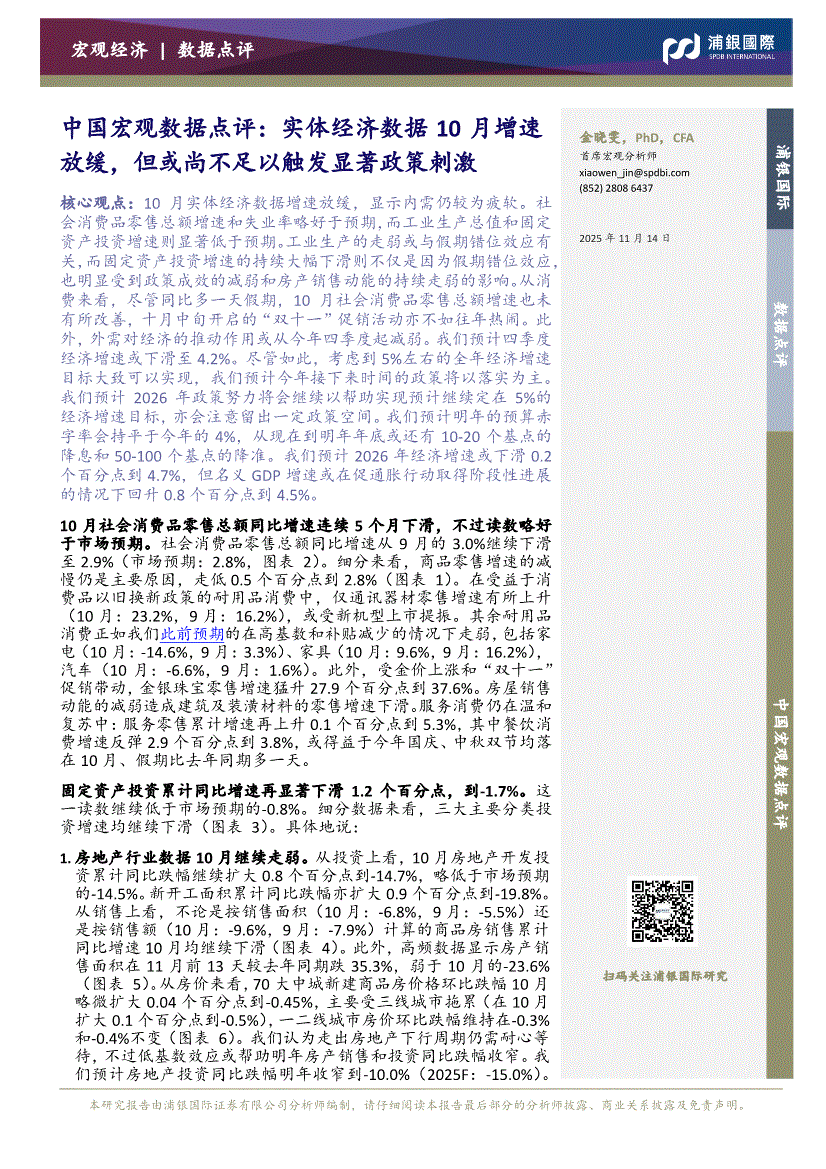 浦银国际-中国宏观数据点评:实体经济数据10月增速放缓,但或尚不足以触发显著政策刺激-251114