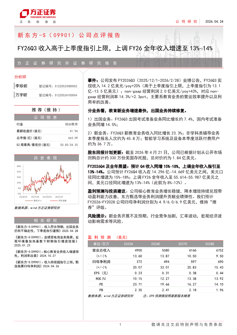 新东方~S:方正证券-新东方~S-9901.HK-公司点评报告:FY26Q3收入高于上季度指引上限,上调FY26全年收入增速至13%~14%-260424