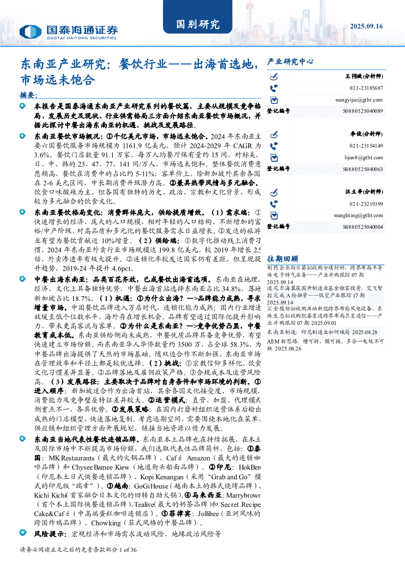 国泰海通证券-东南亚产业研究:餐饮行业——出海首选地,市场远未饱合-250916
