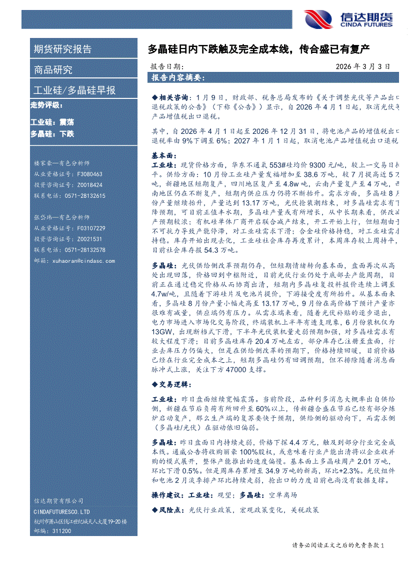 信达期货-工业硅/多晶硅早报:多晶硅日内下跌触及完全成本线,传合盛已有复产-260303