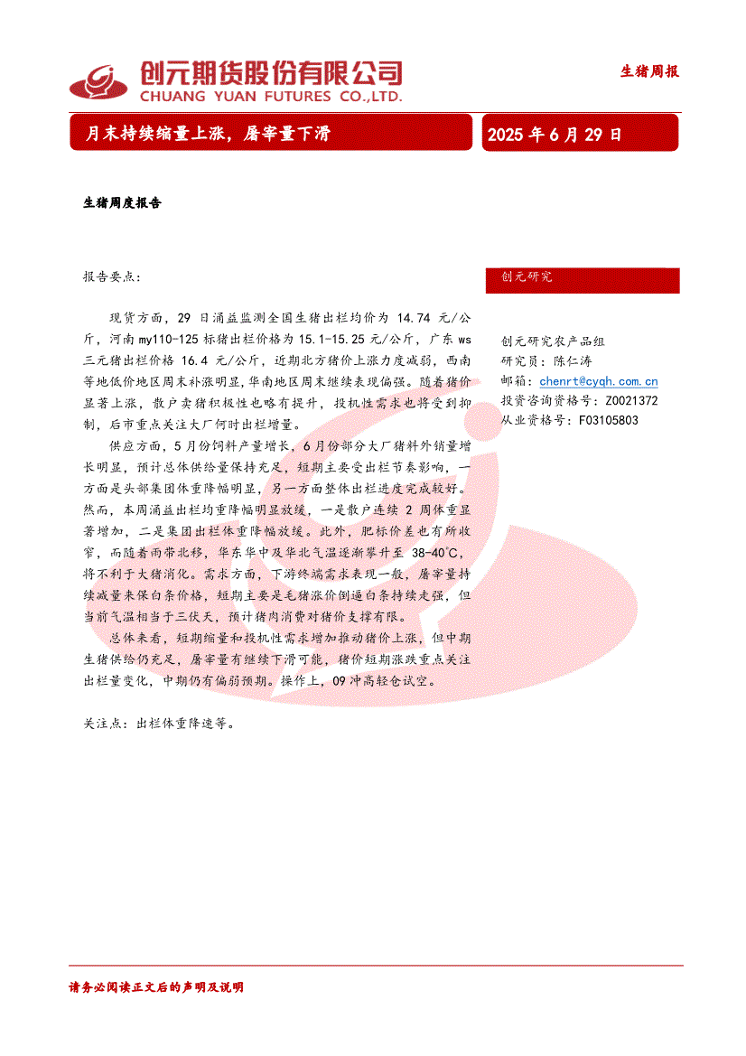 创元期货-生猪周度报告:月末持续缩量上涨,屠宰量下滑-250629