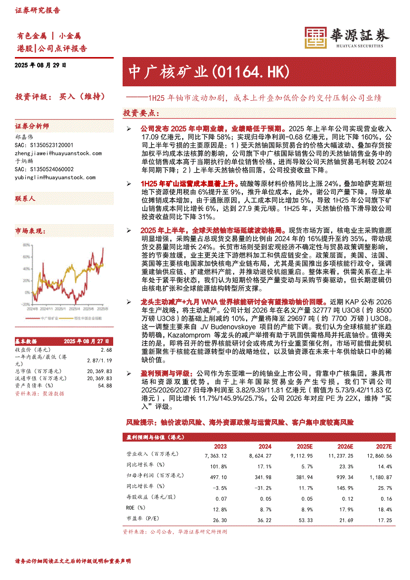 中广核矿业:华源证券-中广核矿业-1164.HK-1H25年铀市波动加剧,成本上升叠加低价合约交付压制公司业绩-250829