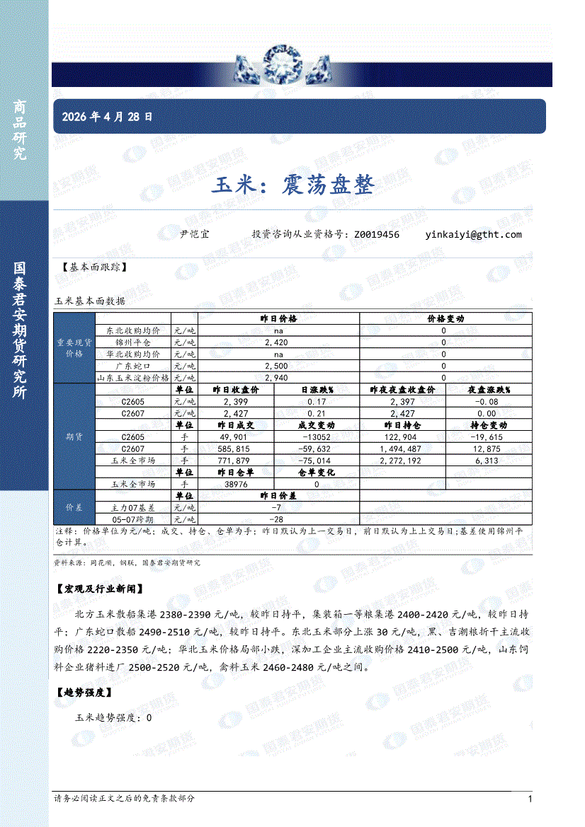国泰君安期货-玉米:震荡盘整-260428