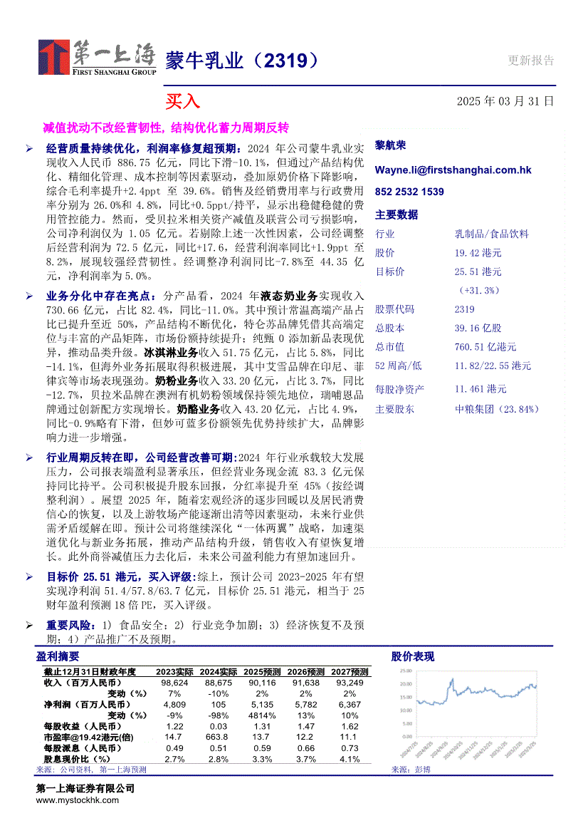 蒙牛乳业:第一上海-蒙牛乳业-2319.HK-减值扰动不改经营韧性,结构优化蓄力周期反转-250331