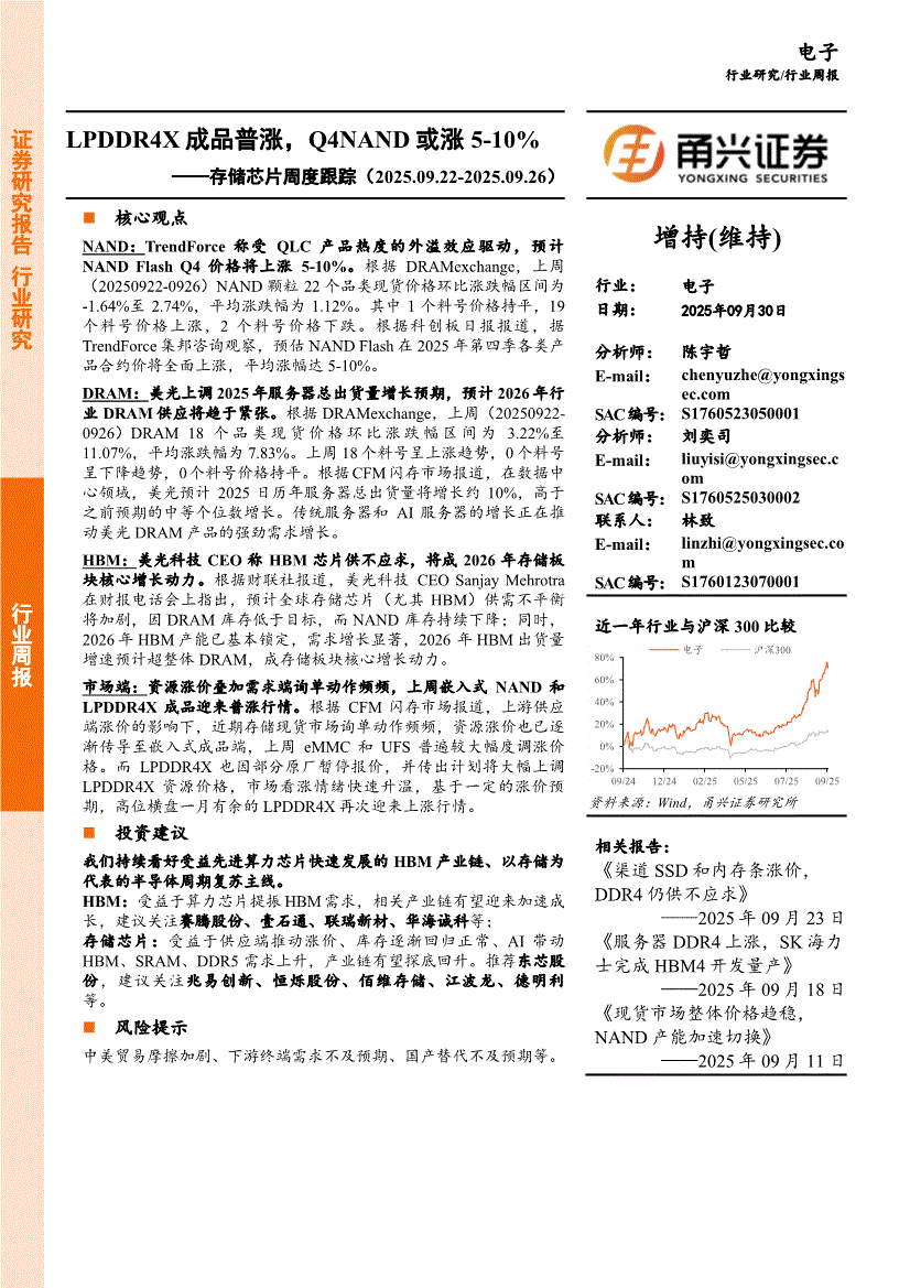 电子行业:甬兴证券-电子行业存储芯片周度跟踪:LPDDR4X成品普涨,Q4NAND或涨5~10%-250930